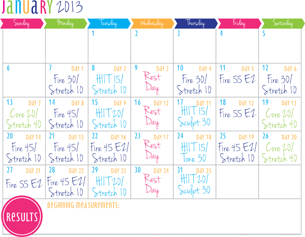 To help track which workout to do on which days, I made this calendar for the next 90 days with some inspiration from iHeart Organizing. I think having a fun and colorful calendar that tells you what your workout schedule just makes it easier to follow!