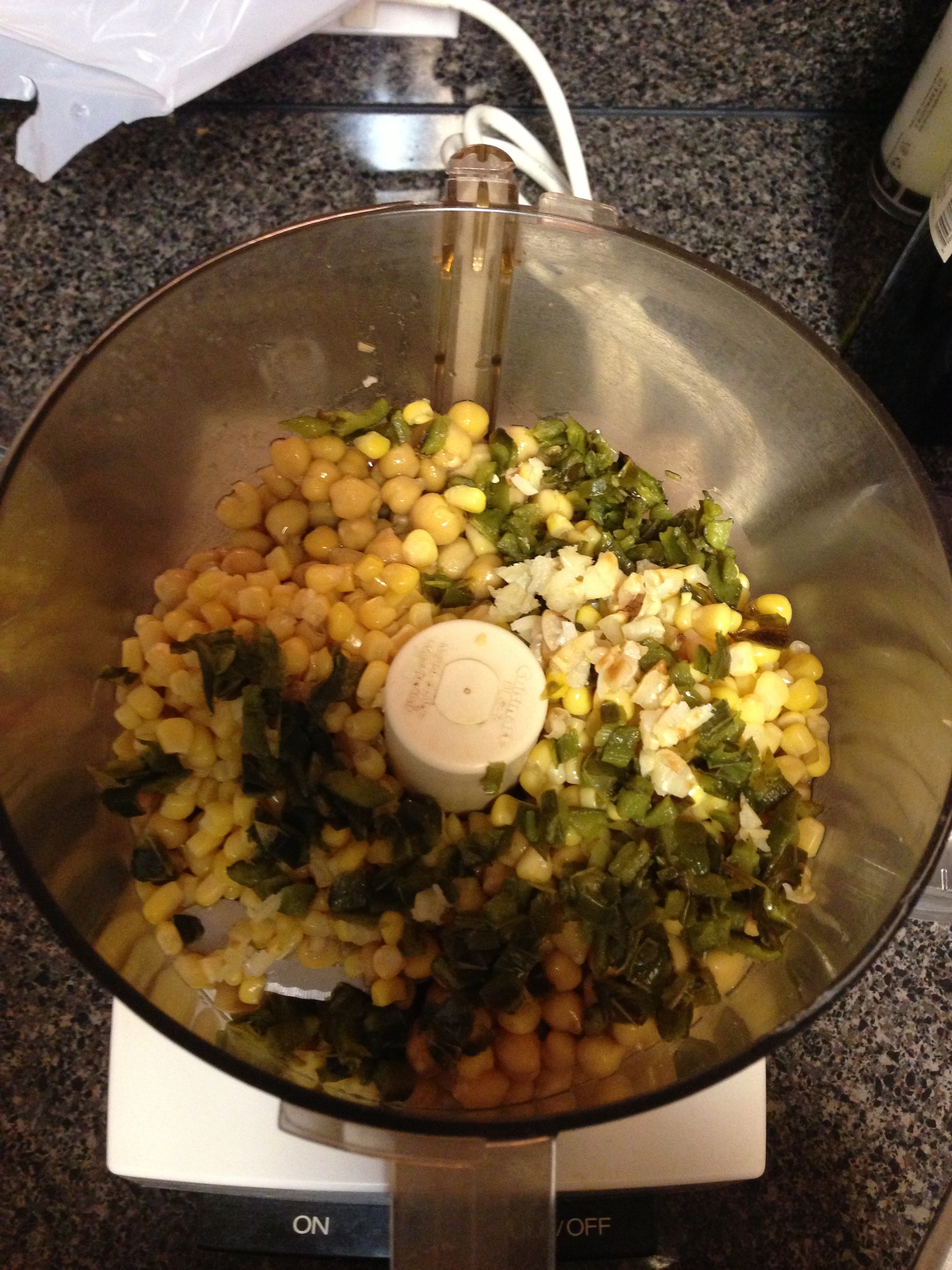 Drain the chickpeas and pour them into the food processor. Yes, I had to borrow mom’s again…I know, I know, I need to buckle down and just buy one! Next add the corn and then chop up the jalapenos and garlic and add as well. I really should try my blender and see if it would work.