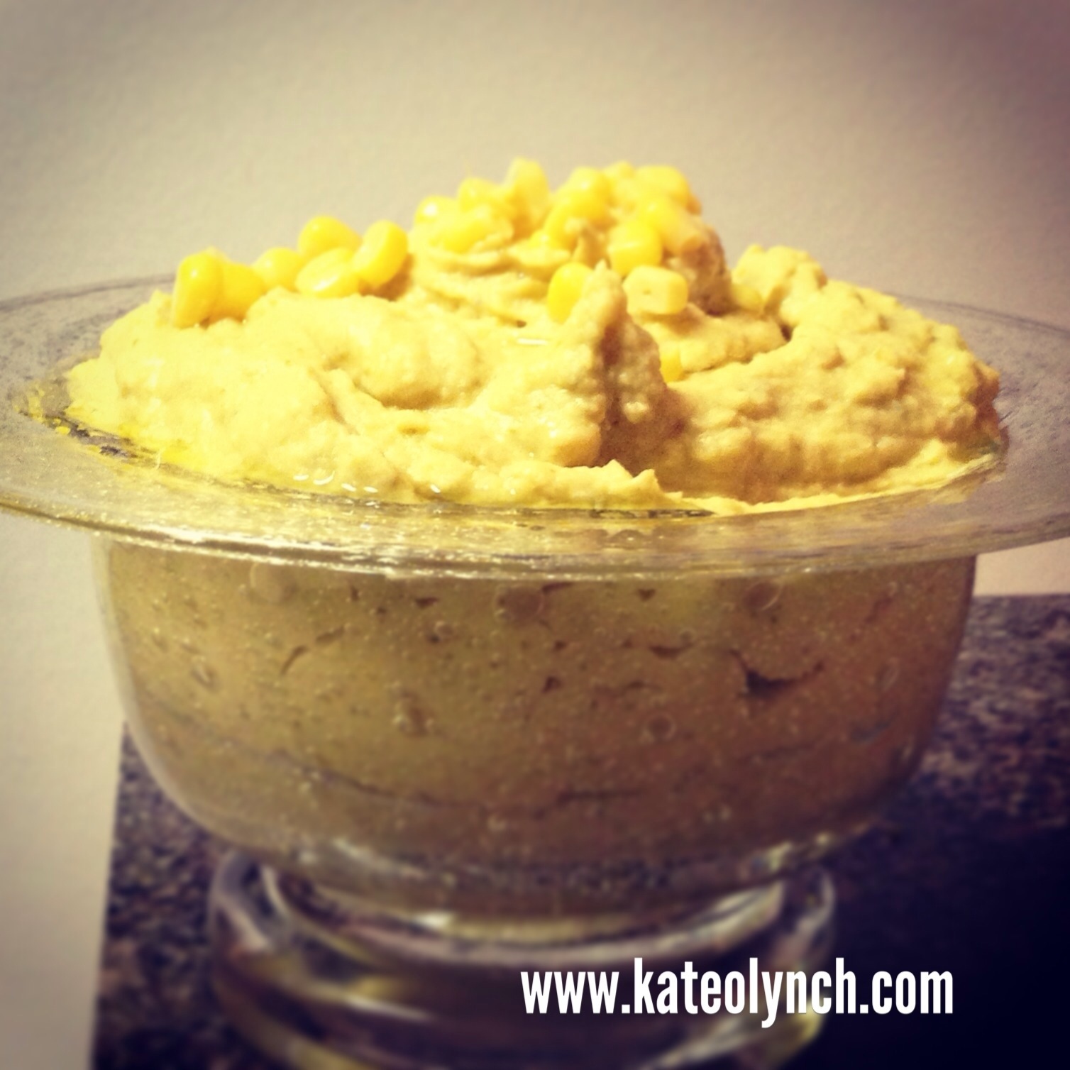 At this point it is ready to go. Just spoon it into the dish you will be serving it in and top with a teaspoon or so of Olive Oil and a little bit of corn. You could even add a little paprika to give it a little more color.